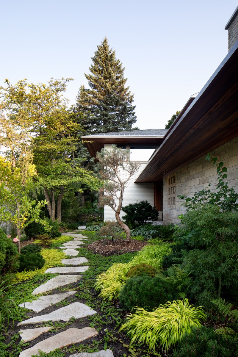 The original design, crafted by Architects Morin & Cinq-Mars, drew inspiration from the architectural work of Frank Lloyd Wright. This major transformation and extension aims to honour the historical essence, while establishing a serene retreat on Mount Royal. The interventions pay homage to this iconic architect and integrate Japanese and Scandinavian influences, which are highly appreciated by the owners. The result is a spacious, welcoming living space that is deeply connected to the natural beauty of the surrounding forest.