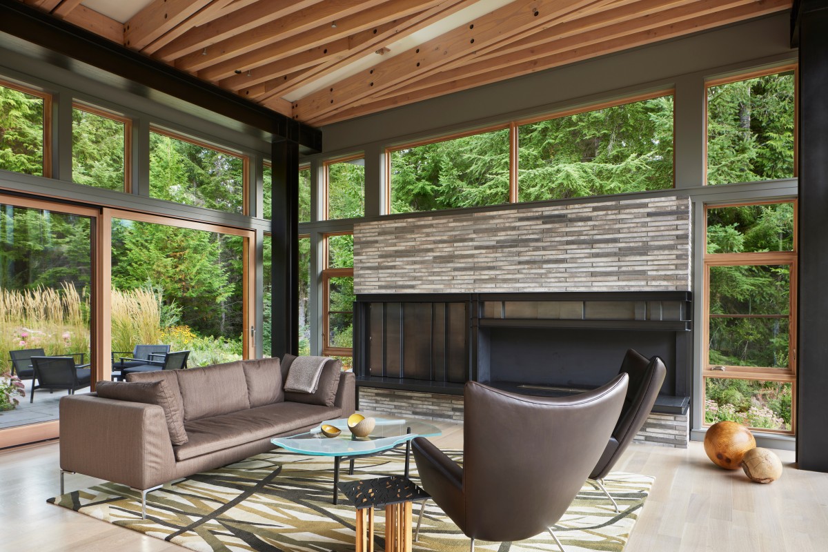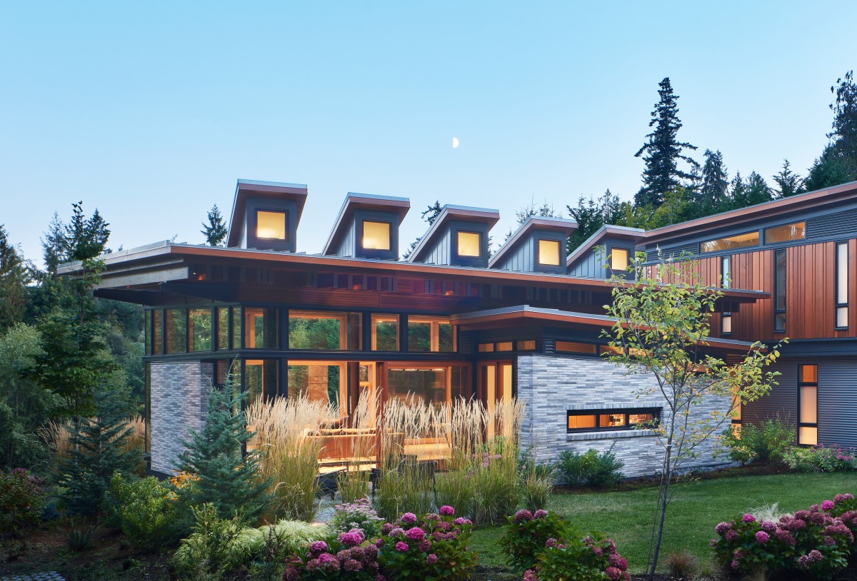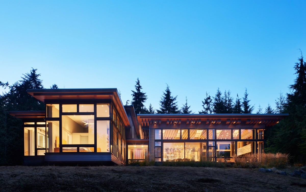 FINNE Architects proudly introduce the Bainbridge House, a secluded sanctuary on a wooded 3-acre site on Bainbridge Island, a small city in western Washington State. A 500-ft driveway winds through the woods up to the house, located in a clearing at the top of a gentle hill. The house opens to a gently sloping meadow on the south side of the clearing.