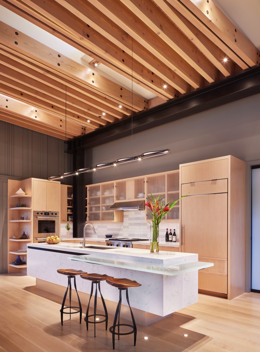The living pavilion ceiling has a dense pattern of exposed wood beams, interrupted by five shafts of light coming from roof light monitors. Each light monitor is rotated slightly from the orthogonal geometry of the wood beams, so there is a sense of movement across the wood ceiling. The light monitors in the ceiling begin at the kitchen and then unfold as visitors move through the space. The dining table is placed across from the kitchen, with large sliding glass doors opening to a raised terrace overlooking the meadow.