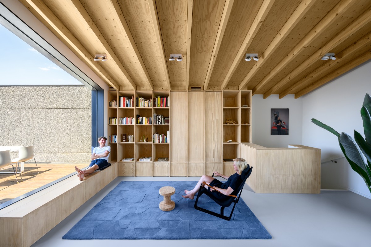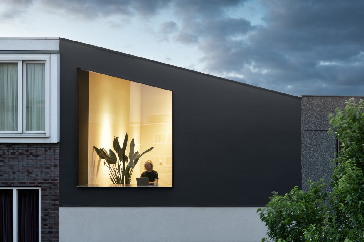 The front one extends into the interior as a desk while framing the view to the neighbourhood. The rear one facing the roof terrace and garden evolves into a bench where one can relax and enjoy the sky. In contrast with the black shell the interior has a warm and light character. Both the ceiling and the connected built-in wall cabinet are built up from wood with clear matching partitioning and refined detailing.