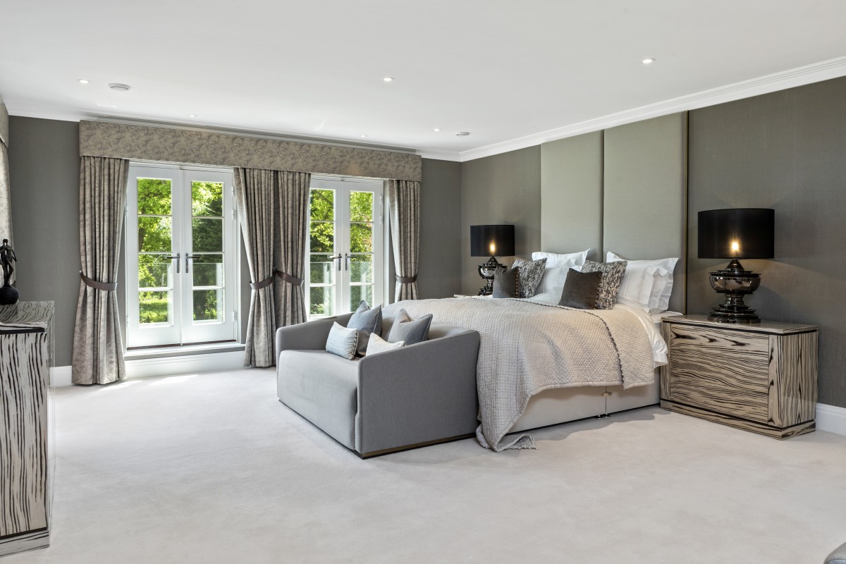 “If I had to give a favourite room, it would be the master ensuite. Hidden behind pocket doors leading from the generous master bedroom, the bathroom is a masterclass in the use of book-matched marble. A feature bath sits central to a quadruple length walk-in shower, whilst a substantial roof-light provides views of mature Oak trees, providing a wonderful connection with the outdoors.”