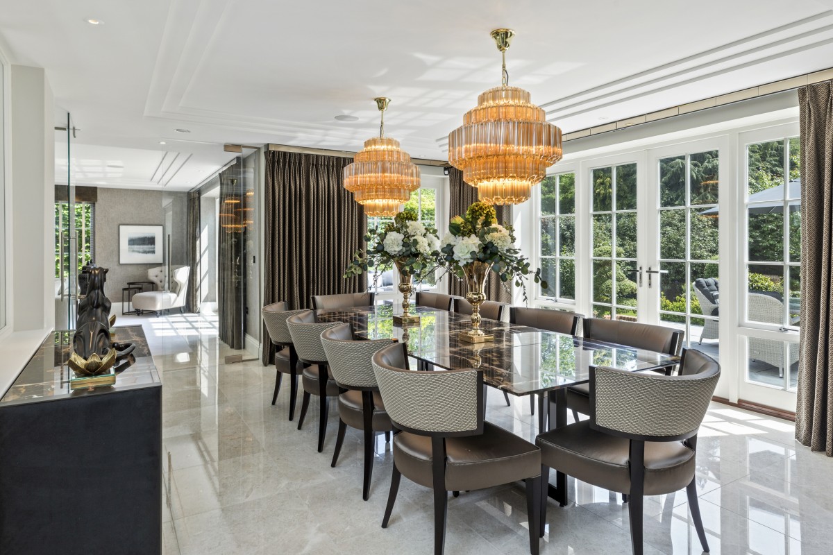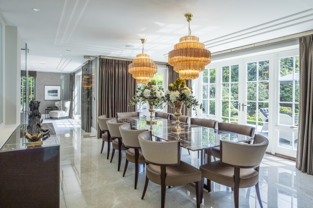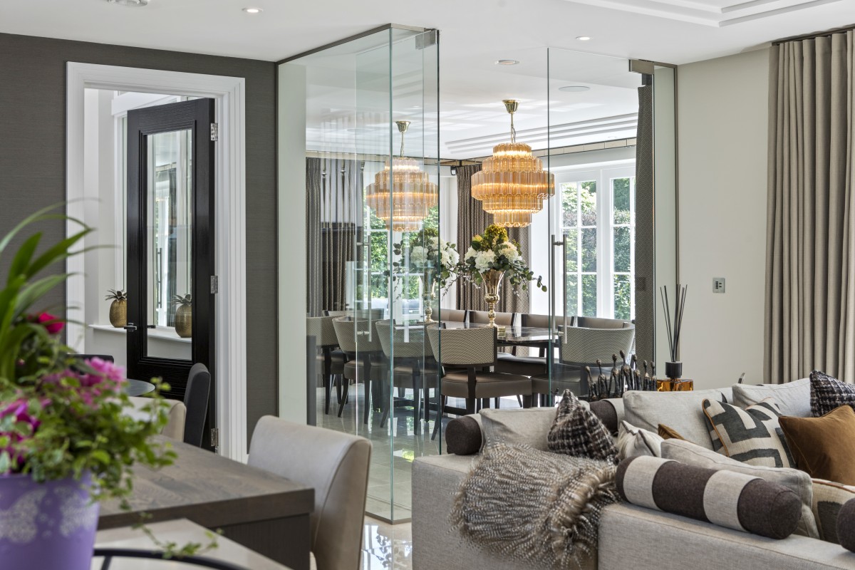 Small details make a huge impact, with coffered ceilings throughout the ground floor reception rooms creating a unique and visually interesting feature, while L-shaped glass partitions on each side of the dining room enhance the sense of openness, and provide a practical barrier to prevent kitchen aromas travelling through the ground floor.