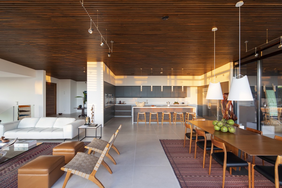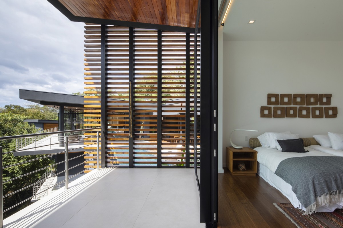 The home is an example of modern tropical design, where the seamless indoor-outdoor connection and the integration of the natural jungle and the ocean view is the main focus. Importance on natural materials with the usage of natural teak siding and sun control screens, contrast with the charcoal-grey stucco surfaces and soft earth-tone floors to provide a palette which integrates into the intense greenery of the natural landscapes.