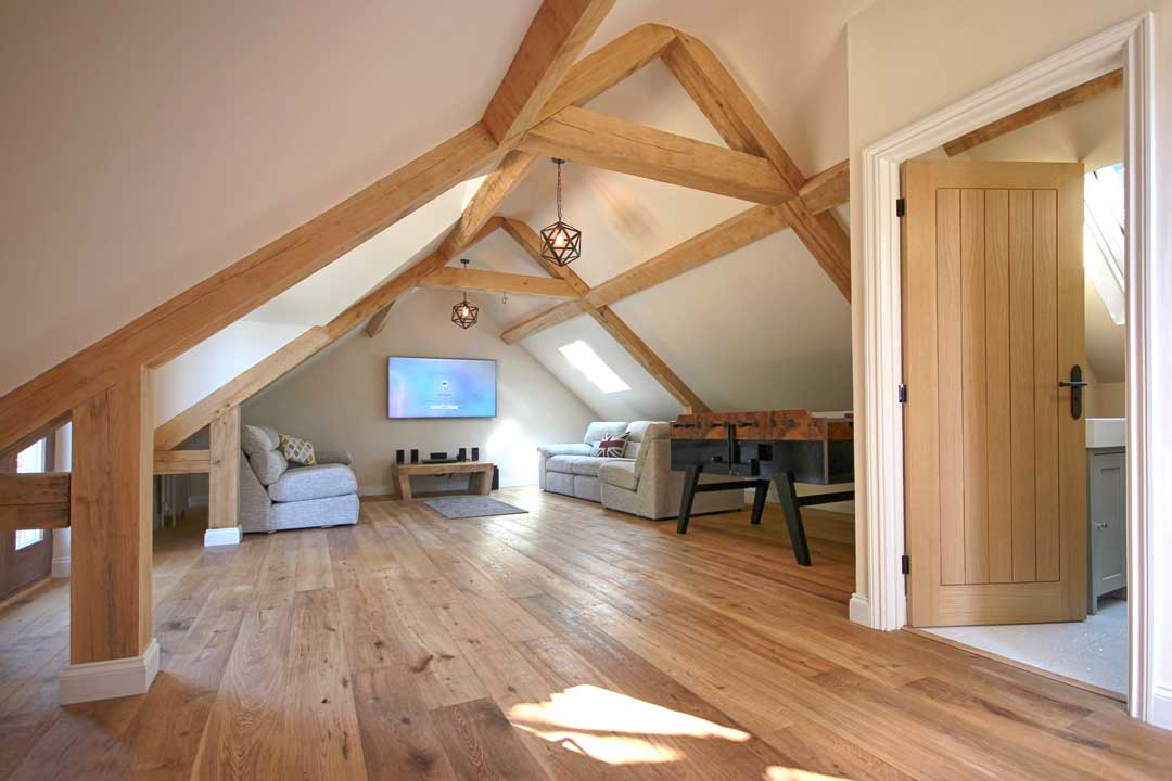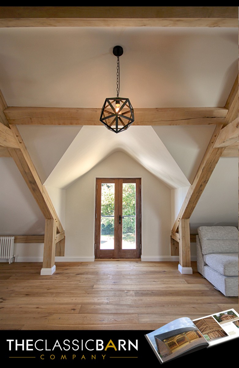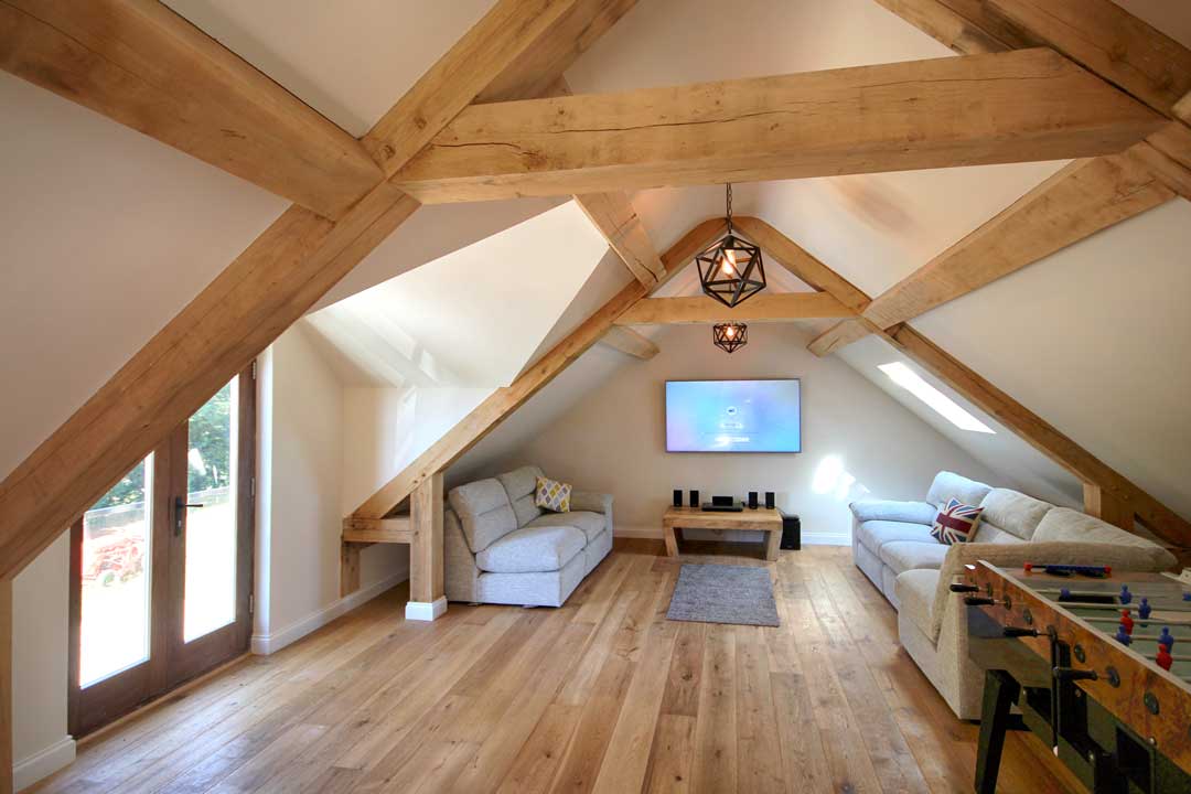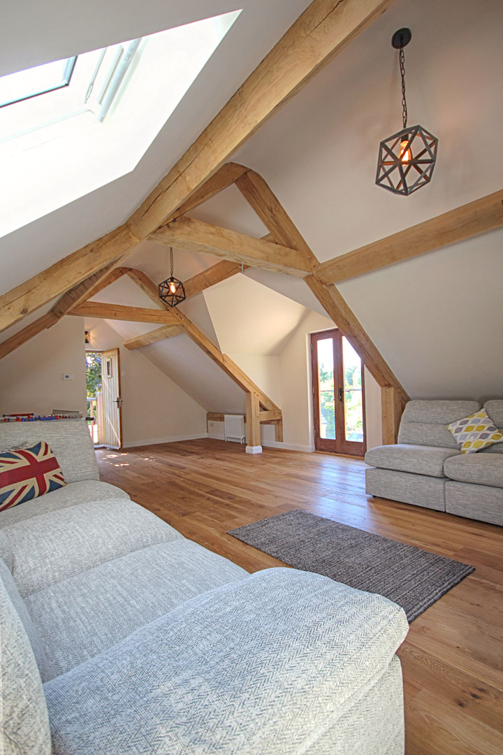 Even though the oak-framed barns, additional spaces, storage areas and so on are created for entirely practical needs, The Classic Barn Company designs buildings that retain a traditional air and which sit well within their surroundings, purposefully designed to enhance the principle property. The oak-framed buildings use traditional mortise and tenon joints, needless to say, for time-honoured reasons. The joints themselves are a noted feature of each build, and allow the traditional oak frame to hold it position whilst gradually settling with age. Hand-carved curved beams are a highly sought-after feature and look delightful within the open-span roofs. Director Andrew Guppy explains how their range of Room Above Outbuildings was developed as an addition to their portfolio and adds habitable accommodation with a heightened level of bespoke detailing. To summarise, Room Above designs begin as a modular frame, which is then fine-tuned and tweaked by the design team to become an individually bespoke extra room above tailored to the clients budget. These room above garages with accommodation are perfect guest rooms for family and friends, and are considered to be an investment for the future, as well as providing space and convenience to any home. Some are used as holiday lets to generate income. He adds ‘All our living space designs are very highly specified regarding insulation and ventilation, are finished to a high standard of interior design, and are considered to add style, comfort and practicality to a busy household’.