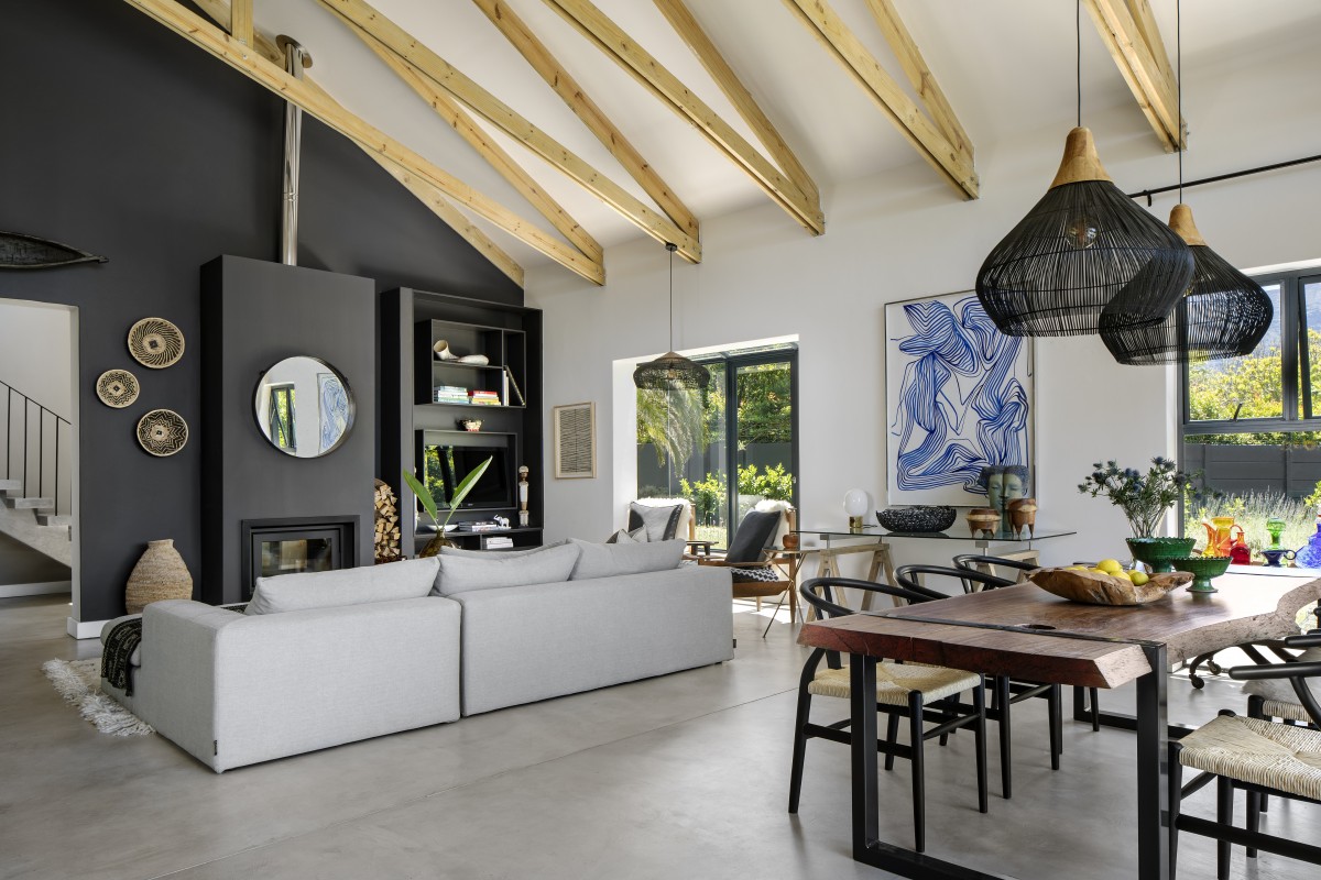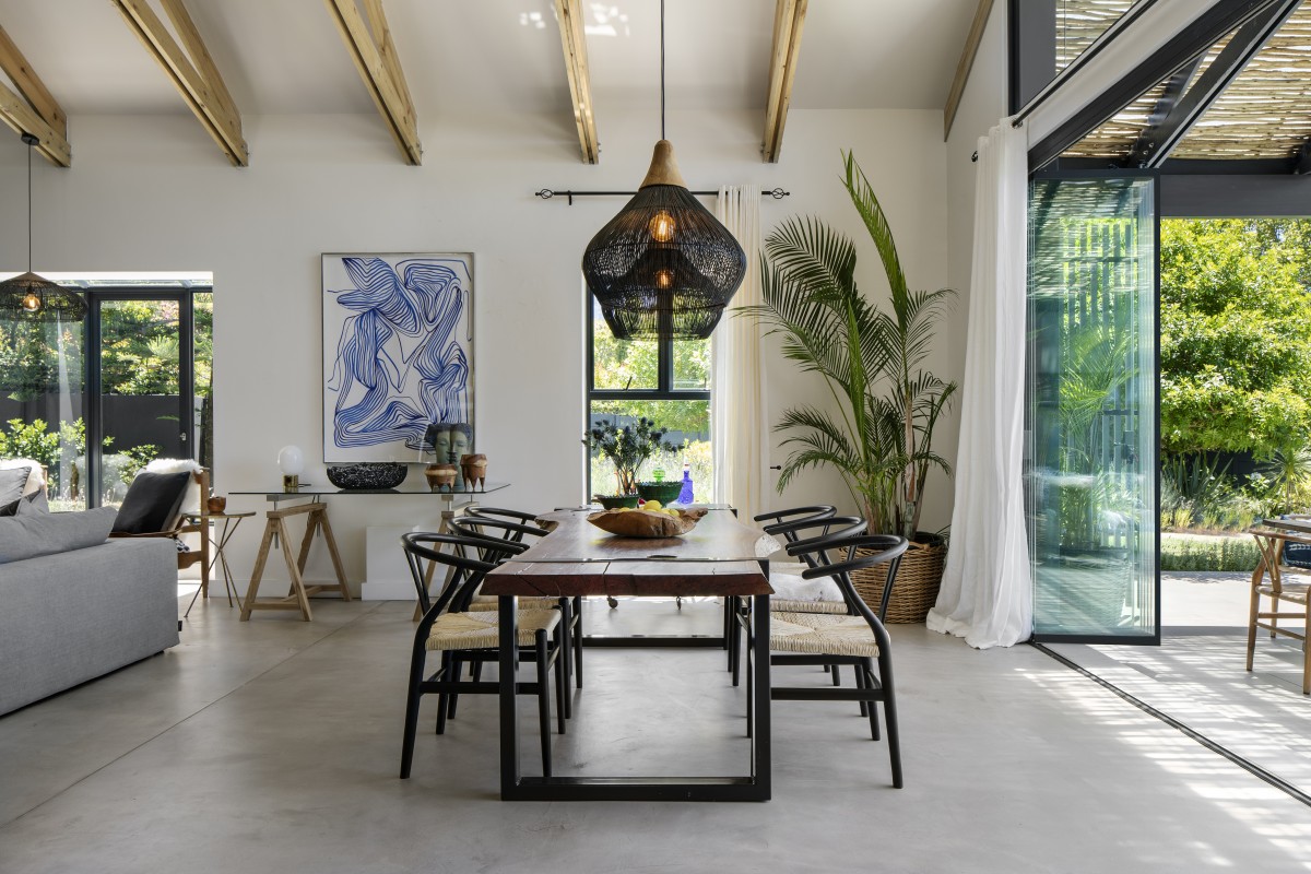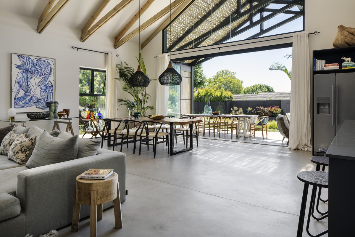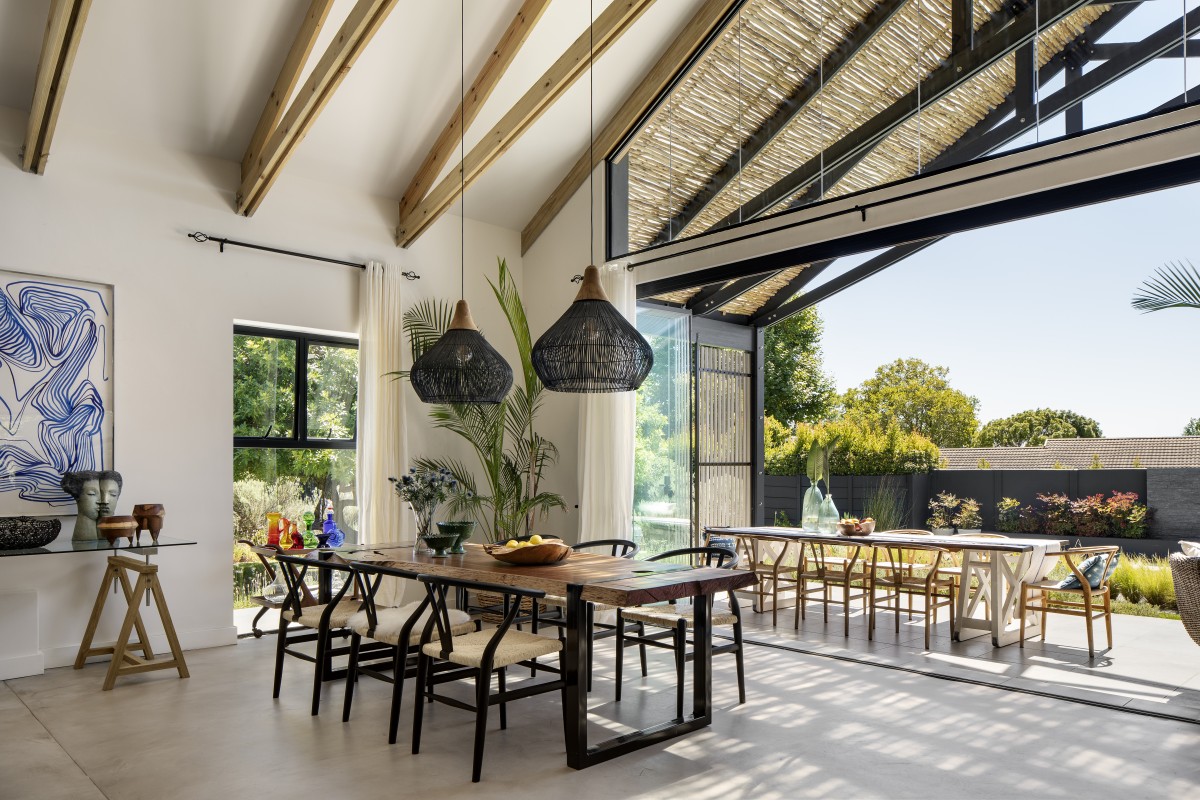 The wall on the south elevation in the living room is fully glazed with three meter tall glass doors at the bottom opening completely onto a covered external dining table which seats ten. With the doors open it has a wonderful feel of the house being open to nature and has the in-out flow we love.