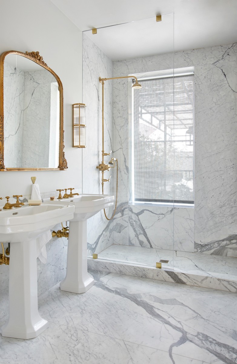 In contrast to the lower floors, the upper levels are more partitioned and intricately programmed. On the first floor, guests are welcomed into an open, yet formal parlor. Large pocket doors open into a rear library leading down into the cube below. Unique Italianate trims, moldings, and colors distinguish the library and parlor, evoking a true sense of the building’s original character. A refurbished wooden staircase leads from the entry hall to the more intimate second floor. At the top of the stairs, a personal study, adorned with bookshelves and a pair of glass doors, leads out to a roof terrace overlooking the garden. The second floor also includes the primary bedroom suite, which features a working fireplace, a restored bedroom niche, and a marble-clad bathroom. The third floor features a pair of bedrooms and bathrooms, each with unique wall coverings, fixtures, and lighting.