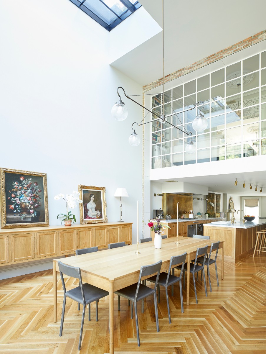 The cube addition is a minimally-adorned, double-height extension that stands in contrast to the upper floors. It is free of all moldings and partitions, a characteristic that extends throughout the garden level. The narrow edging of the kitchen cabinetry, the elegantly thin borders of the custom herringbone floor, and the thin lines of each light fixture set the aesthetic of this floor. Ancillary programs such as the pantry, cellar stairs, powder room, and wine storage fill the narrow space along the Western edge of the kitchen.