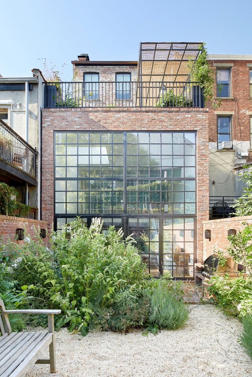 The removal of the rear wall exposes the contrasting qualities of the parlor and garden levels. While the upper level retains much of the building’s original detailing, the lower floor does not. A thin metal portal outlines the opening, drawing attention to the contrast. On the lower level, the incision allows for a continuation of an open plan. On the upper level, a gridded glass wall infills the portal and creates a delicate veil to the more traditional character of the upper floors. Taking cues from 19th-century Brooklyn building traditions, the glass wall becomes a porous threshold between the old and new.