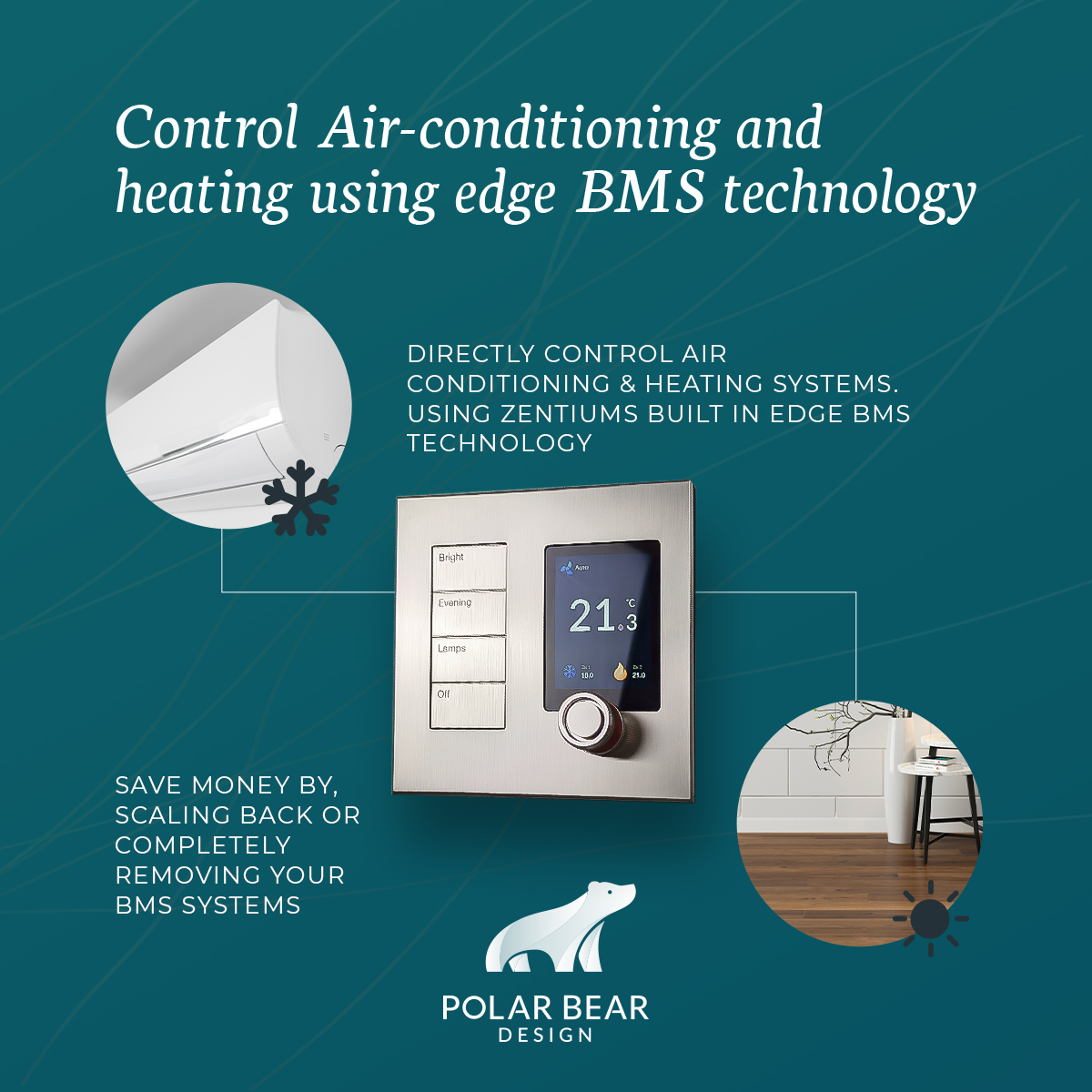 Manufacturers seem to want to create their own isolated eco system and have an app for everything. Polar Bear Design takes a different approach, a customer centric approach. This does not mean that the Polar Bear Zentium thermostat is not smart, far from it with its ARM processor and Edge BMS technology. We create a customer led approach by ensuring that the Heating and Cooling controls can be integrated and compatible with as many different control systems as possible which includes the traditional HVAC controls, but also the AV Controllers such as Control4, Crestron, Lutron, AMX etc. This creates a singular interface for the user and the HVAC becomes part of the solution of a Smart Home.