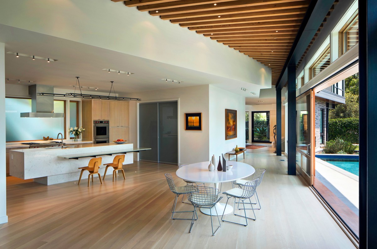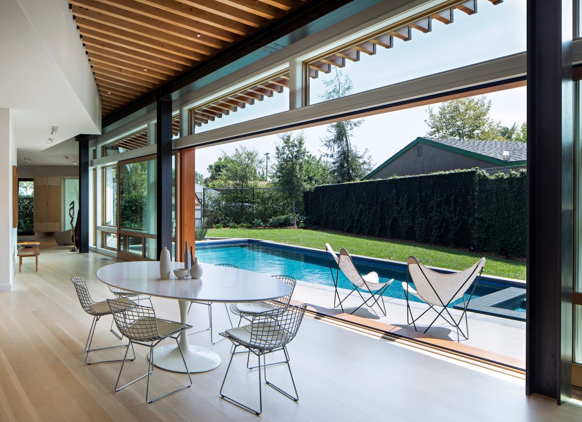 The living area is enclosed by a continuous glass wall, protected by a 6-ft roof overhang. Oversized 8-ft by 10-ft sliding glass panel doors open directly to the pool, creating a seamless indoor-outdoor environment. The living pavilion itself is constructed with wood, both exterior and interior, establishing a contrast of warm wood to the cool metal siding that wraps the bedroom wing. The living roof is a hyperbolic paraboloid composed of tightly-spaced Douglas Fir beams. The beams gradually reverse their slope from one end of the living space to the other end, creating a curving interior line where the beams frame into the wall of the bedroom wing. The curvature of the hyperbolic paraboloid is made entirely with straight beams.