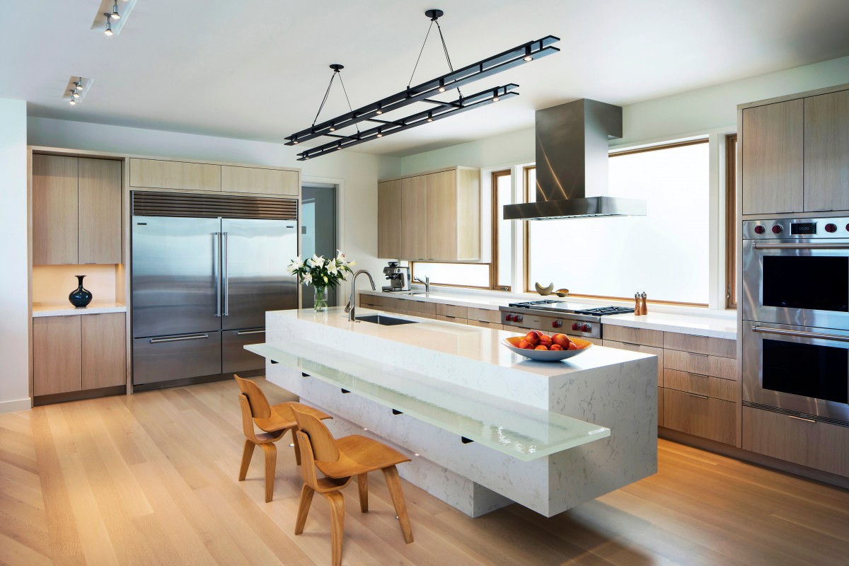Simplicity rules the choice of interior finishes. White-bleached rift-sawn white oak cabinets and floors are combined with calm, white plaster walls.