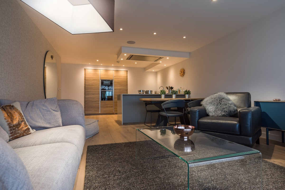 Bespoke contemporary kitchens have been created by leading Cornish designer, Treyone, and are equipped with state-of-the-art Neff appliances, as well as ceiling mounted extractors and feature lighting.