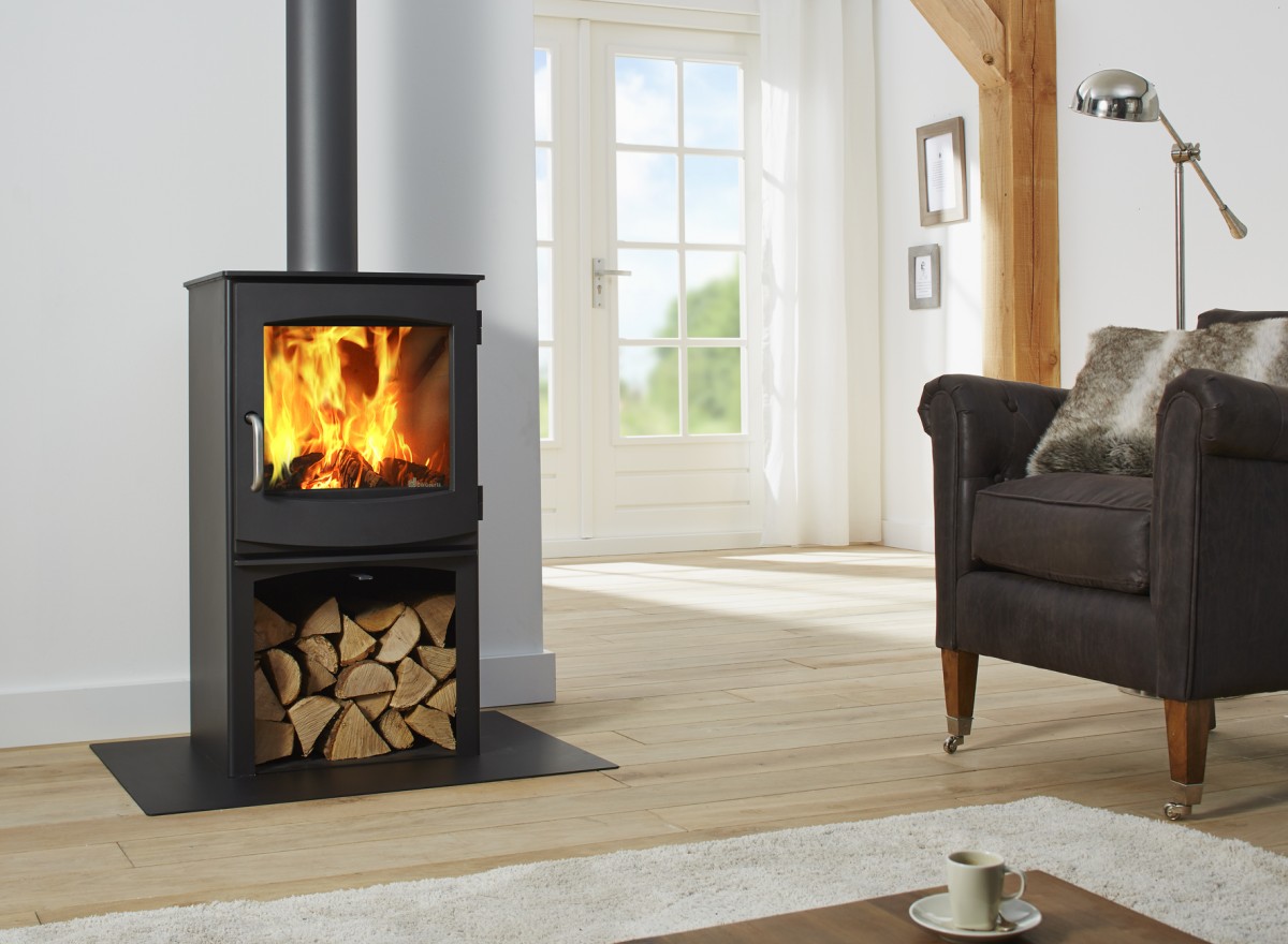 Another freestanding stove that offers great versatility of installation is the Dik Geurts Modivar. It is an attractive, portrait-shaped wood stove with a choice of log storage compartments and plinths to suit different styles of living space, making an elegant room feature as well as an efficient source of heating.