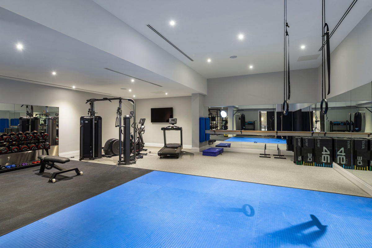 The lower ground floor of their spectacular home houses a gym of gargantuan proportions, kitted out to professional standards, with room enough for the World Cup winning Springboks 15 to train in comfort. Then there is the playroom, with full size pool table, cinema screen wall, and long 90-degree angle cocktail bar in beaten metal, facing enough sumptuous high stools for a dozen or so house guests. A dumb waiter from the ground floor utility room opens in the bar area, providing the family’s very own ‘Deliveroo’ service, perfect for both partakers and observers of competitive sports.