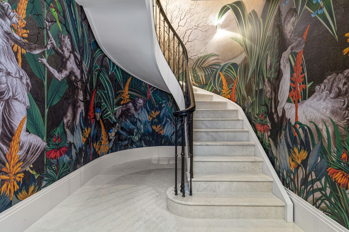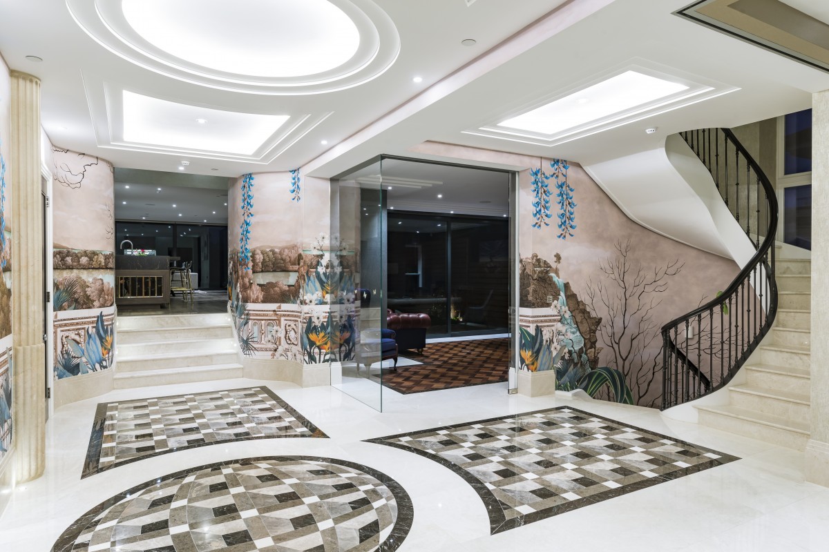 Returning to the astonishing entrance hall – definitely the scene stealer of this extensive home – with no little part due to the specially commissioned digital mural, which extends from the front door, around the vast swathe of walls, and descends via a circular sweep of marble stairs to the lower ground leisure and fitness suites.
