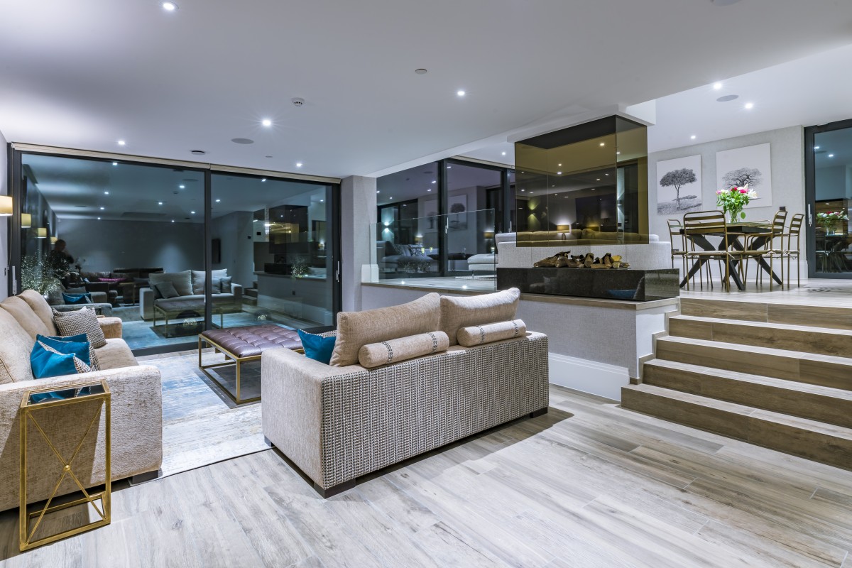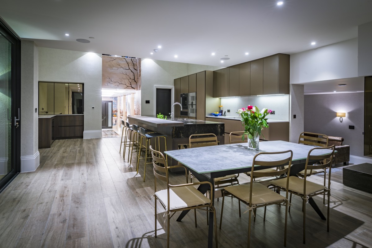 The ground floor living space, with its clever undulation of differing floor levels, takes up a considerable proportion of the 9,000 sq ft home. The soft bronze tones of the Extreme Designs kitchen, with its extraordinary leathered granite work top and latest range of Gaggenau appliances, extend harmoniously into adjoining family dining and sitting areas, with focal point centre piece floating gas fired log fire.