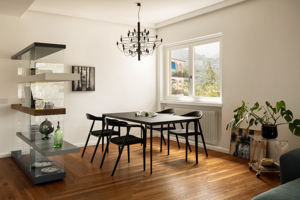 The regular and consequent flow of parallel lines emerges as a common thread in the entire design interpretation of the space and its individual rooms and areas, which it suggests and defines through constant reference to geometries, alignments and projections: what emerges is a residence set apart by a fluid and dynamic scheme, inside which the different spaces follow on from each other with continuous connections and visual references, stylistic and chromatic.