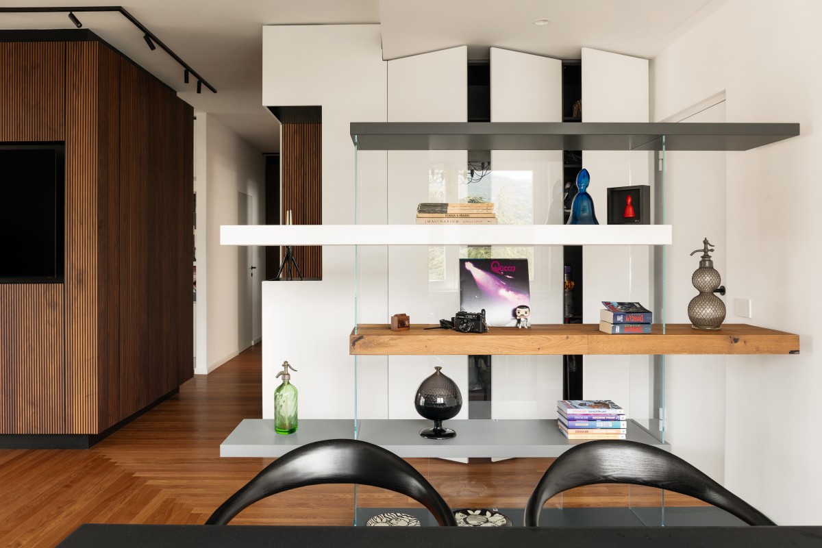 Visually inscribed in a smaller volume but in direct spatial dialogue with the day area, the entrance hall is delineated by the storage/divider represented by the glass and wood “floating” bookshelf, and completed with the presence of large full-height cabinets, camouflaged in the same colour and finish as the walls, with the function of coat and jacket storage.