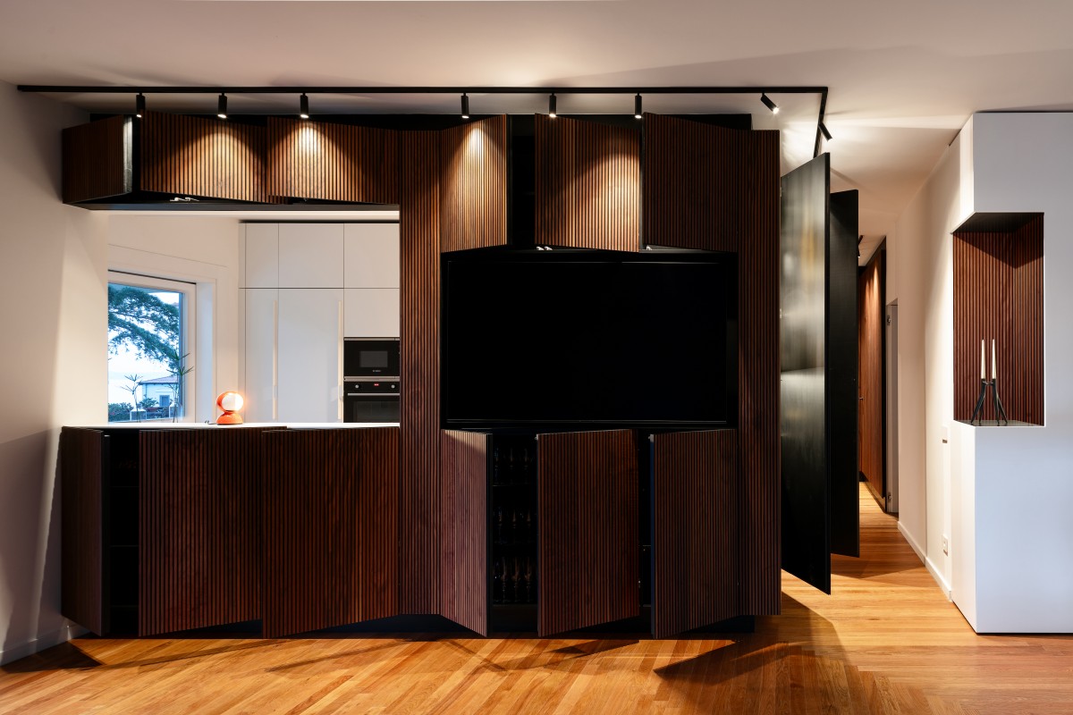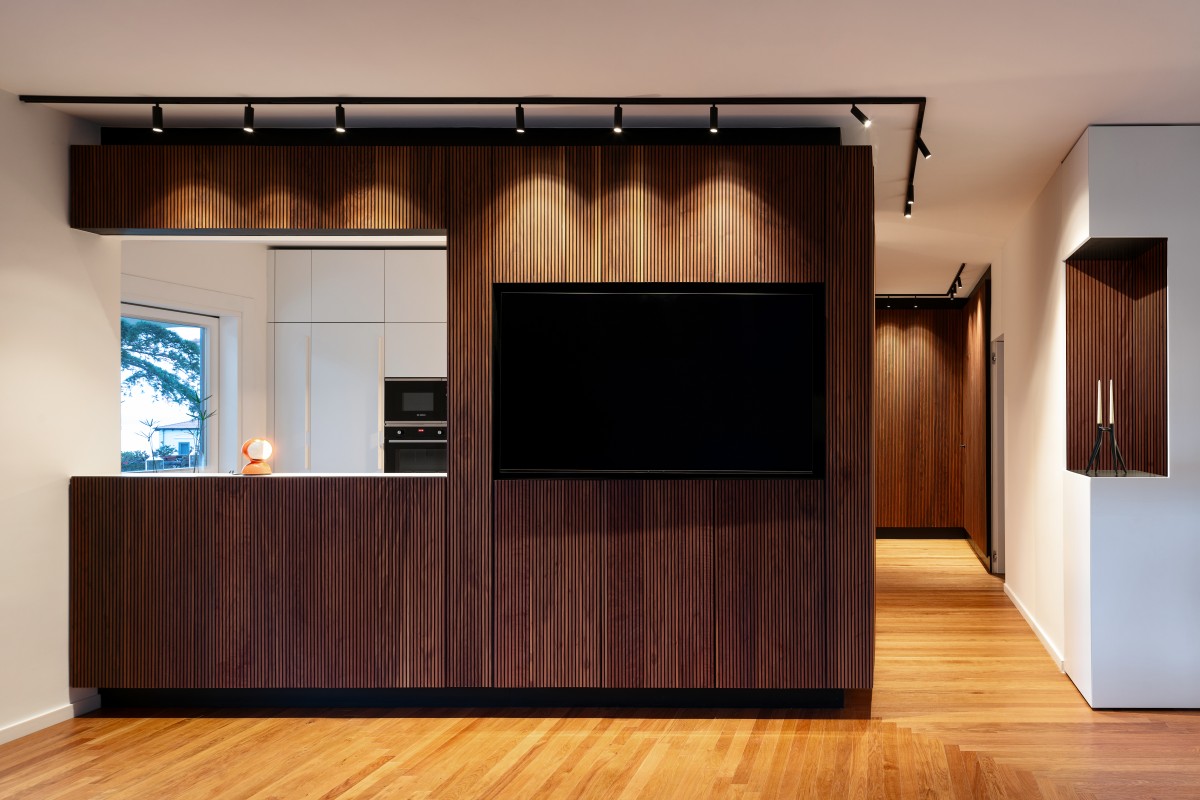 In the living area itself, the slatwall panelling which occupies a significant area emerges as the undisputed protagonist of the new interpretation – architectural, stylistic and formal – of the entire residence: it is the focal point of the design and tangible common thread between the various spaces, making it possible to view the corridor leading to the bedrooms as an extension, both visual and functional, of the living area, a characteristic which is highlighted by the ceiling track lighting system.