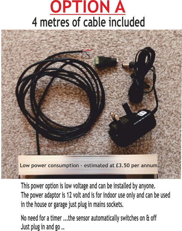 Mains powered… if you have a existing external light it can be disconnected and replaced with your new bright L.E.D. house number light, a small waterproof box will fit the 12v driver in the wall behind the light.