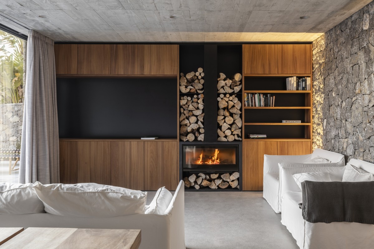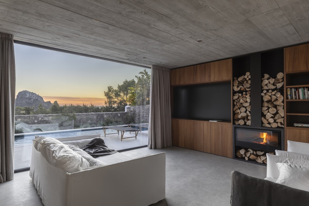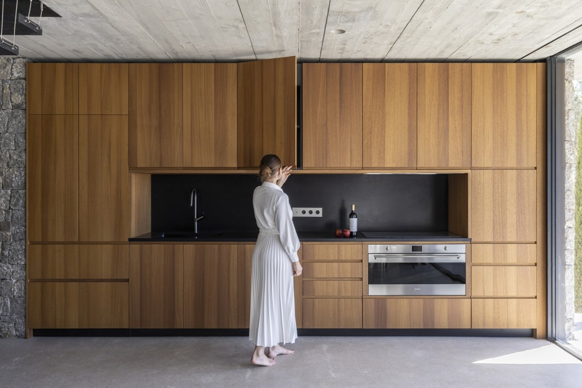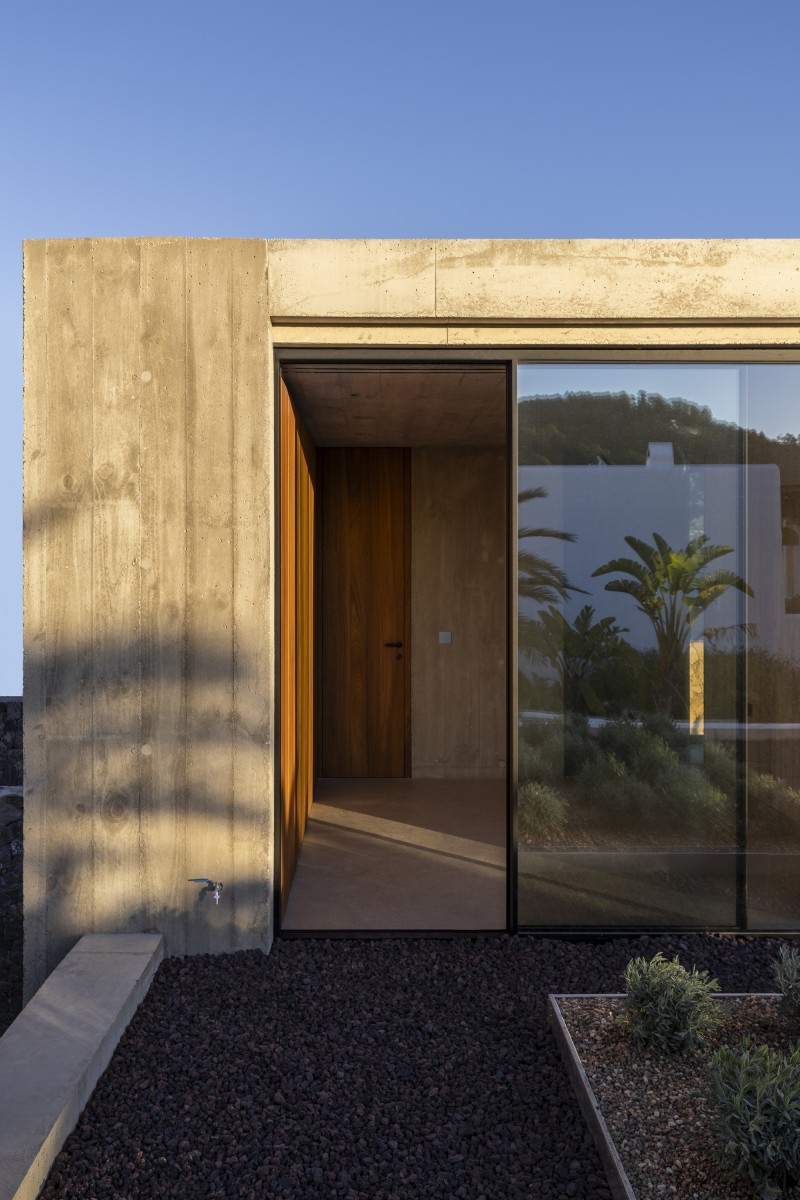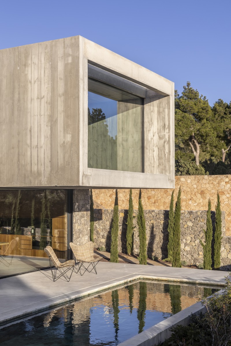 This geometric dichotomy of two adjoining volumes also manifests in the choice of materials: natural stone masonry at ground level and exposed concrete on the first floor. Both materials contribute to the sturdiness of the geometry. Concrete takes, undoubtedly, the leading role of the project. Besides, it is executed with a traditional formwork of wood slats, which adds richness and hues not easily achieved with any other material. The first-floor volume becomes a “concrete box” that appears to be floating above a stone basement.