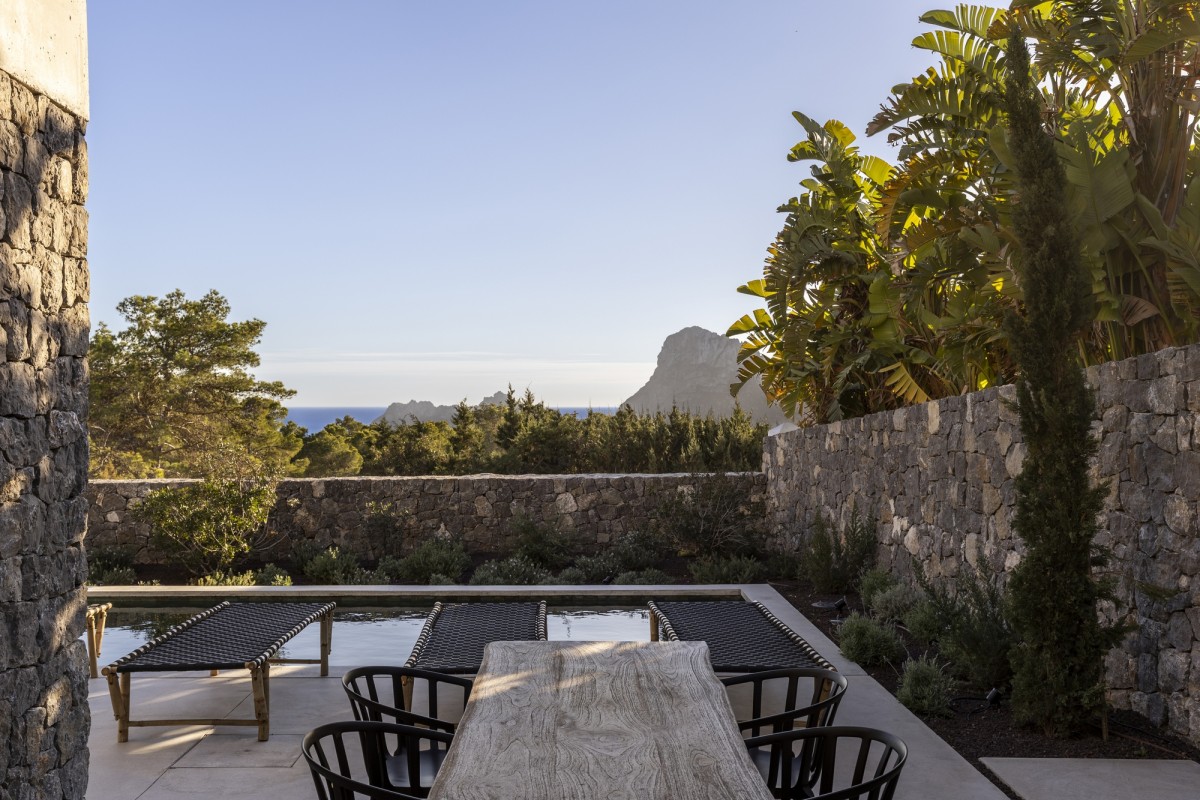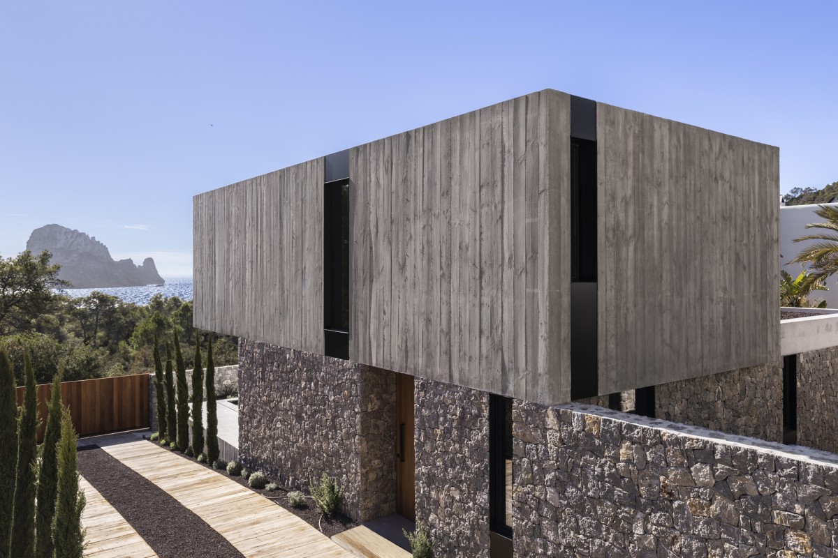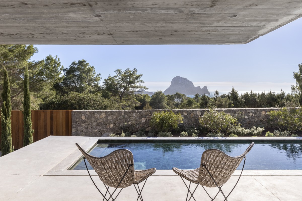 The house sits in the privileged surroundings of Cala Carbó, southwest of Ibiza island. Despite not being a first-line plot, thanks to its location, within the limits of a suburban environment, and the sloped topography of the area, the house possesses magnificent views towards the sea, the sunset, and the magical islet of Es Vedrà.