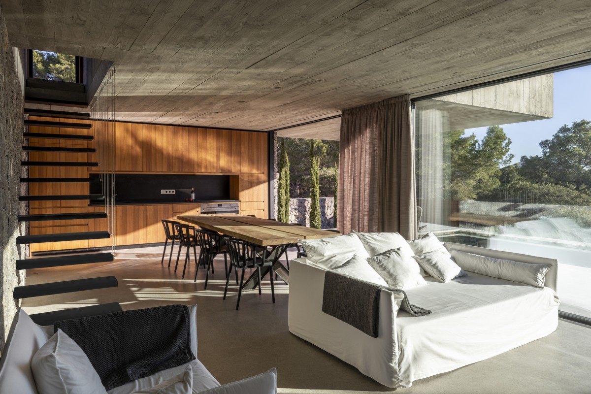 At ground level, the first volume is placed longitudinally along the plot, with an east-west orientation. The main access is located here, as well as a large, open-concept, living/dining/kitchen area, completely embracing the views and the sea, and directly connected to the swimming pool. The program for this floor is completed with service and utility rooms, and one of the bedrooms with an en suite bathroom.