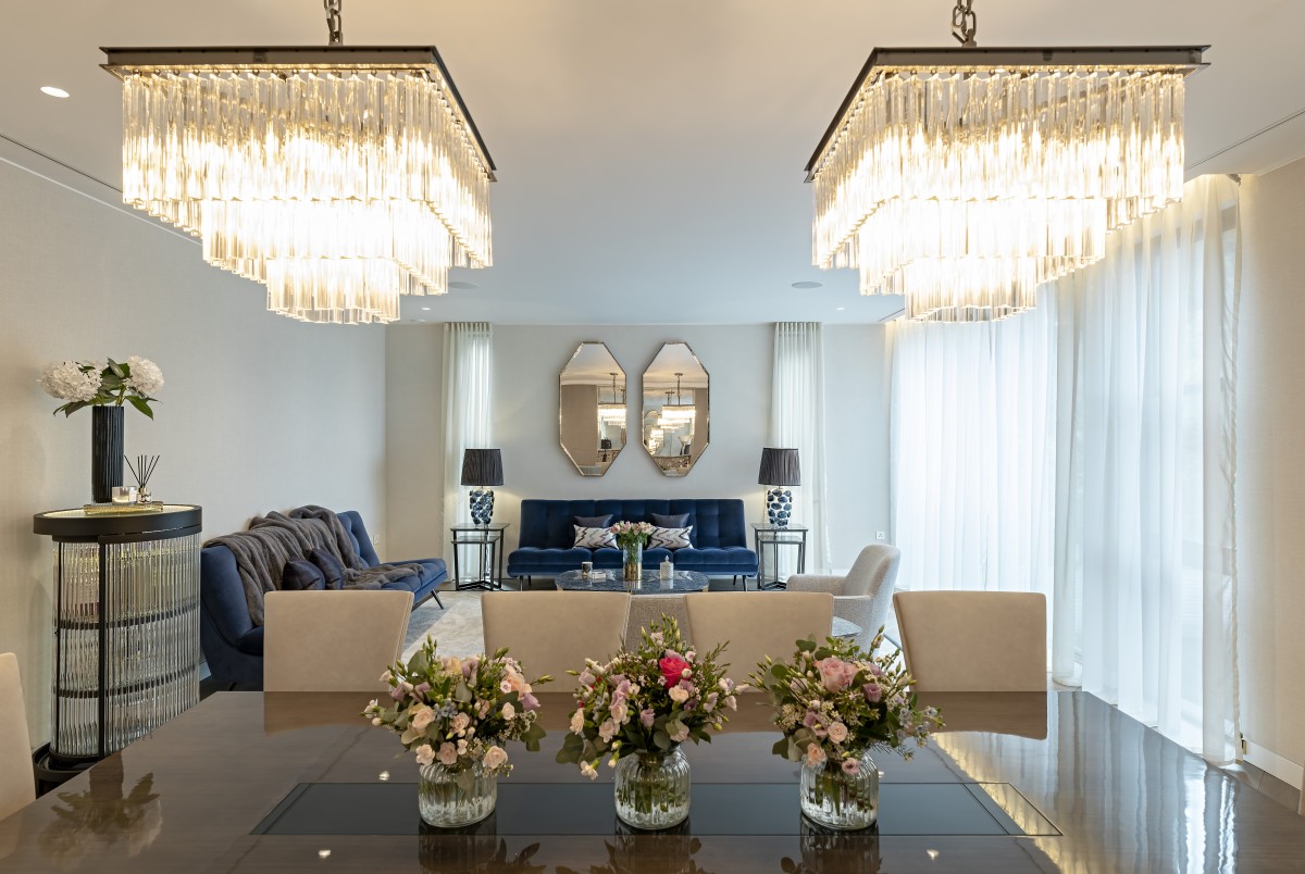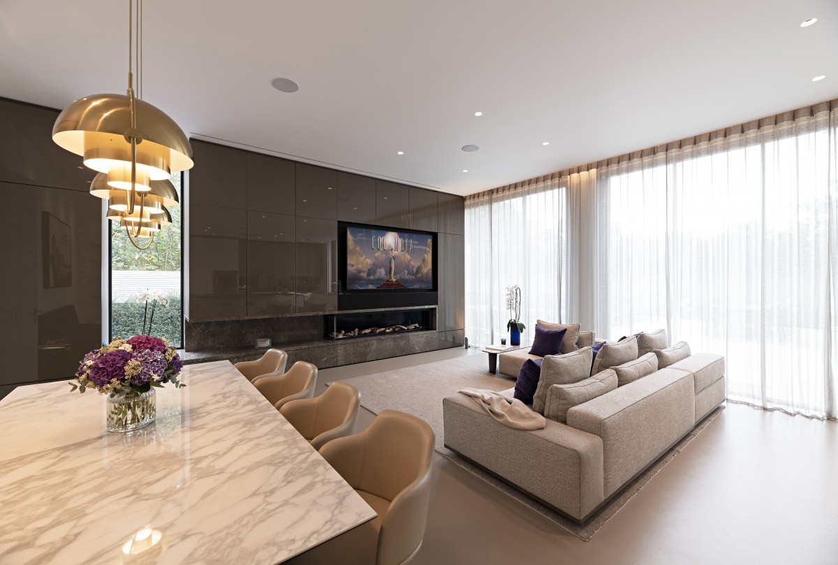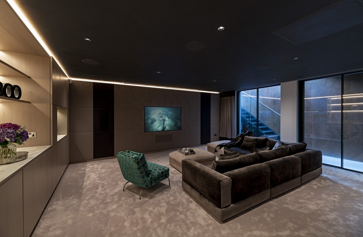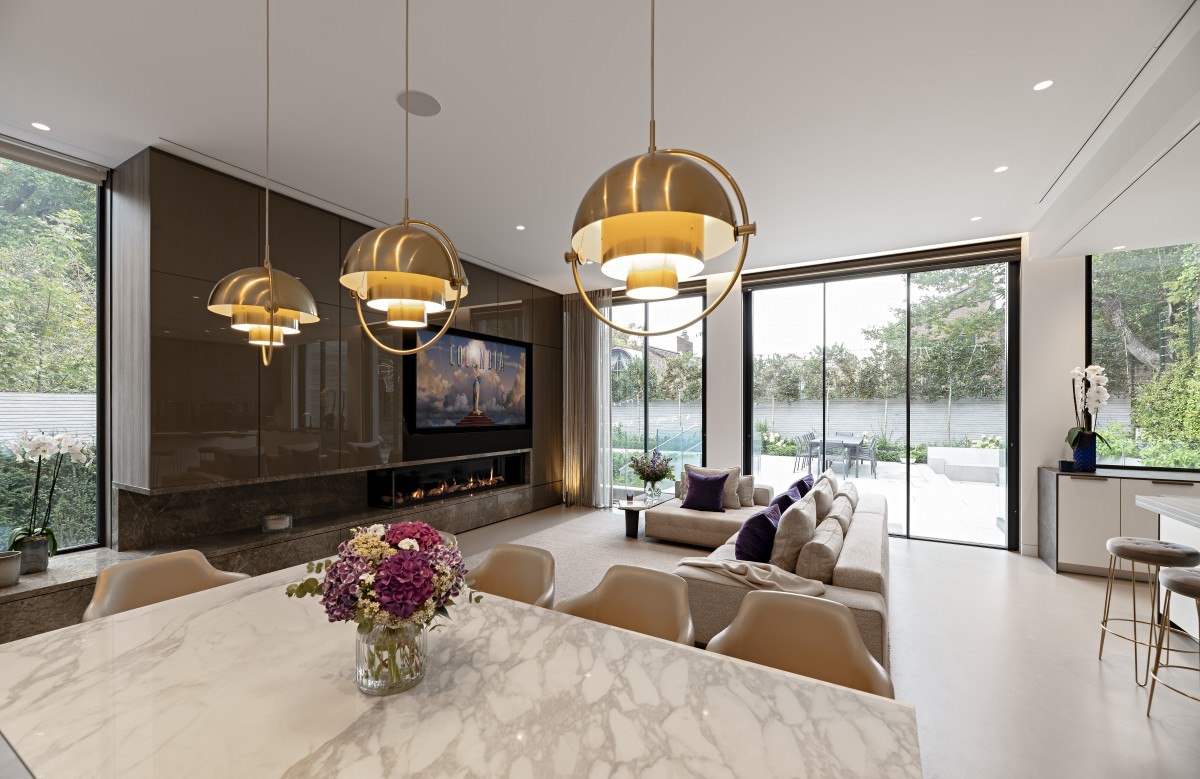 A number of passive measures were introduced, such as highly efficient insulation materials to floors, walls and roof (including the ultra-efficient Optim-R panels to terraces), minimised air permeability and the use of high spec modern efficient fenestrations, the performance was further enhanced with high efficiency installations such as LED lighting throughout including lighting control system, high efficiency appliances and fireplace, as well as the inclusion of energy and building management system. In relation to sustainable elements, Sustainable Drainage Systems (SuDS) water management system has been installed enabling the use of rain water for irrigation; along with the green roofs that also promote habitat creation, this system ensures the water runoff is minimised and regulated. The ambient in the house is supported by the inclusion of cutting edge CHP (combined heat and power) boilers, whilst cooling and heating boost is provided via acoustically insulated air source heat pumps.