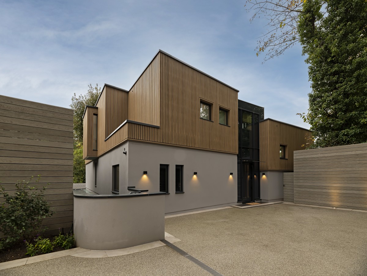 The use of natural shade renders, low maintenance and enhanced longevity mock timber cladding and extensive fenestration kept the overall aesthetic simple and versatile. A fairly minimalist and crisp material palette was adopted to contrast the natural setting including warm hardwood flooring, white walls for the core, ground and lower ground floors as well as timber finish slats. Green roofs were also introduced on each wing to enhance natural habitat creation as well as helping the building blend in the large garden, particularly from neighbouring higher vantage points.